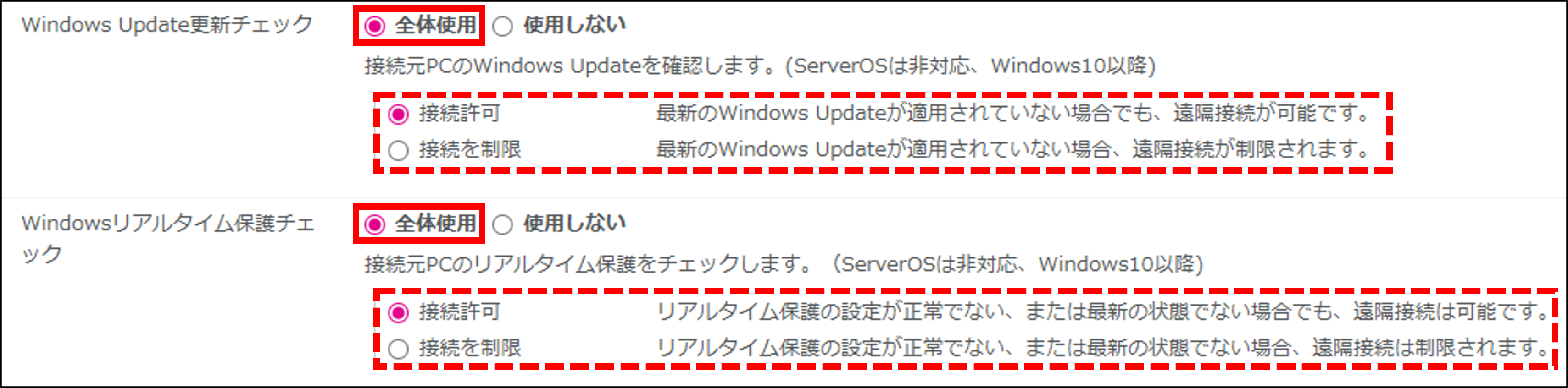 Windows OS Updateやセキュリティプログラムが最新ではない場合、遠隔接続を行えないよう制限することも可能です。