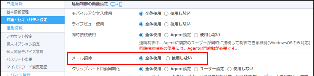 「環境設定」>「共通・セキュリティ設定」>「メール招待」