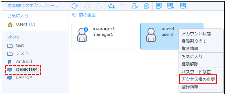 ①ユーザー管理>ユーザー管理タブで表示される右側リストのAgent PCを選択>操作権限を確認したいユーザーアカウントを右クリック>アクセス権の変更