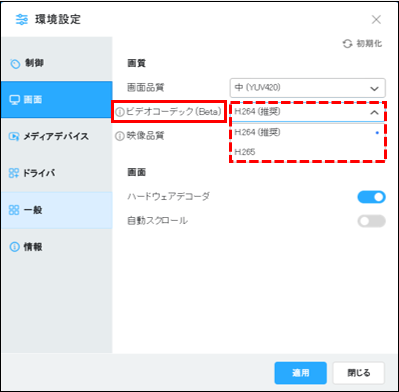 [RXビューア > R: > 環境設定 > 画面 > ビデオコーデック(Beta)]