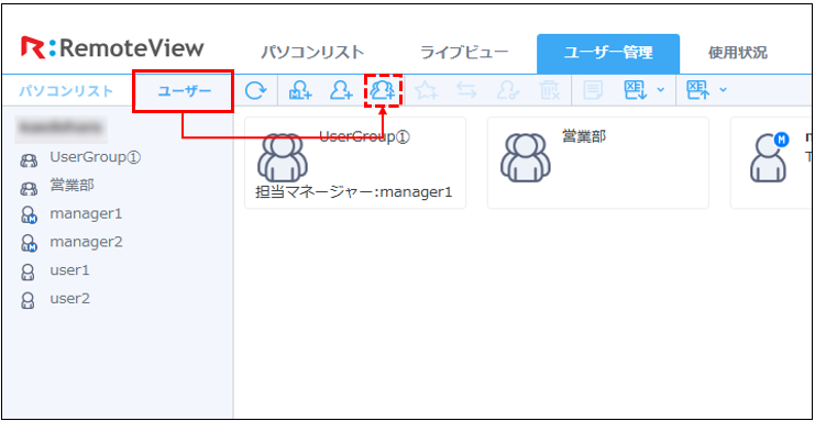 「ユーザー管理」タブにてツリーメニューで「パソコンリスト」を選択している場合、「ユーザーグループ追加」ボタンが活性化しません。 ツリーメニューで「ユーザー」を選択した状態で「ユーザーグループ追加」ボタンを押してください。