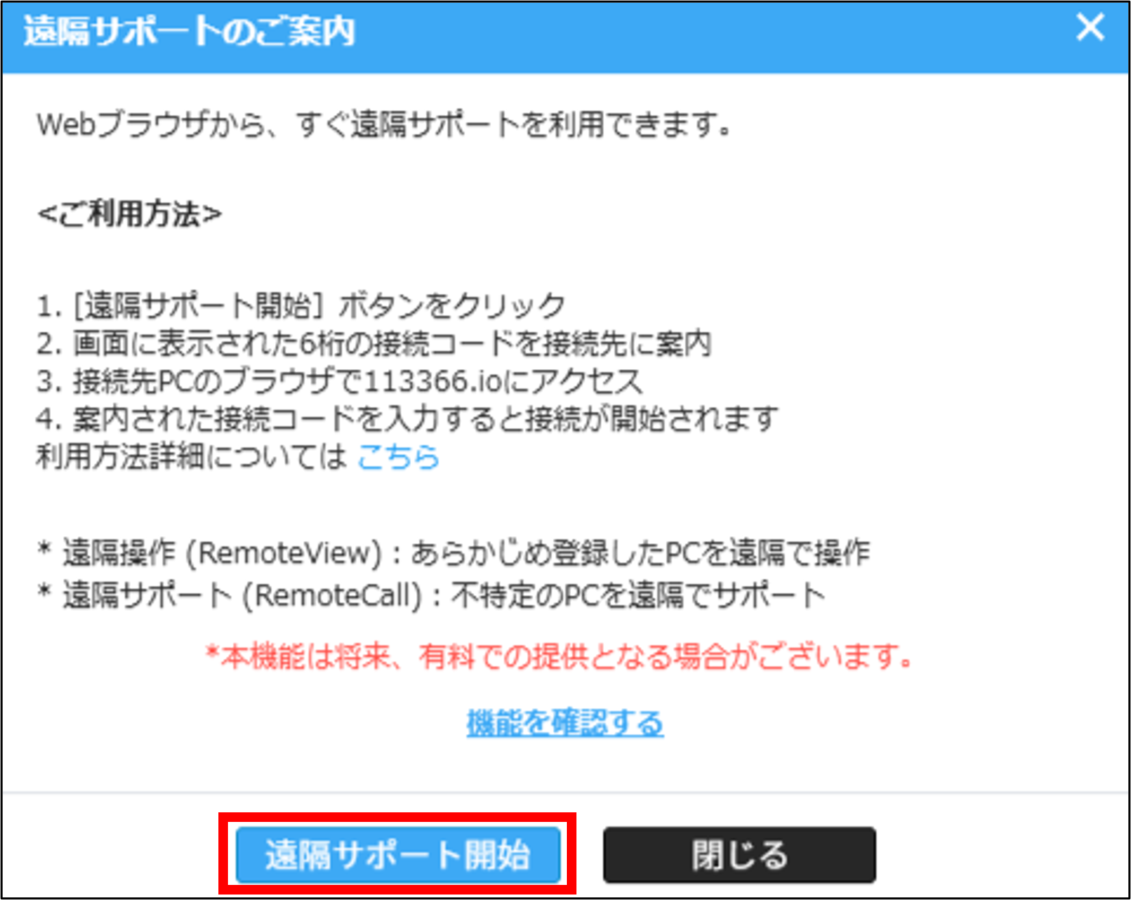 表示されるポップアップから「遠隔サポート開始」をクリックします。
