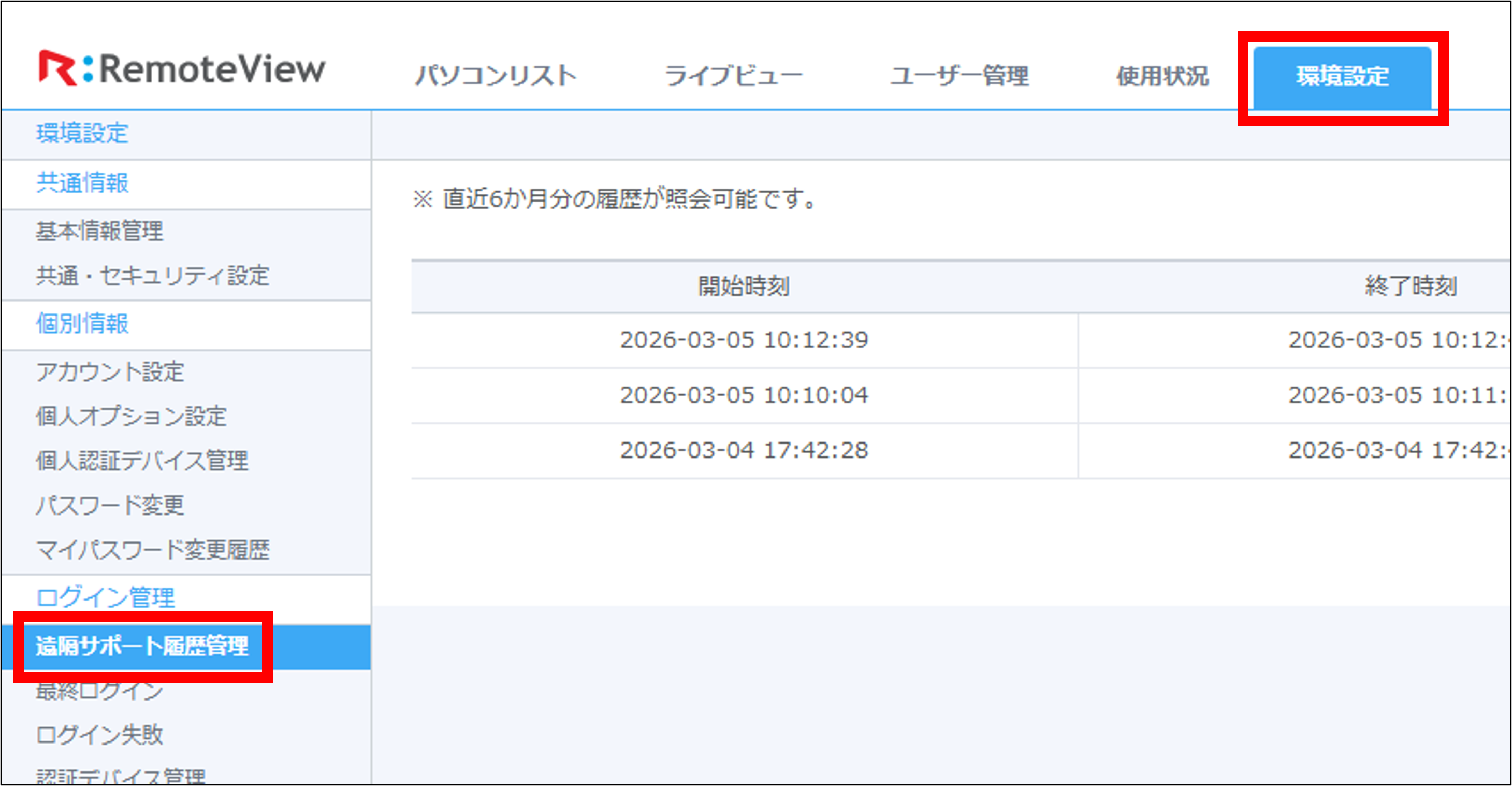 管理者権限を持つユーザーは、以下の手順でWebビューアによるサポート履歴を確認できます。