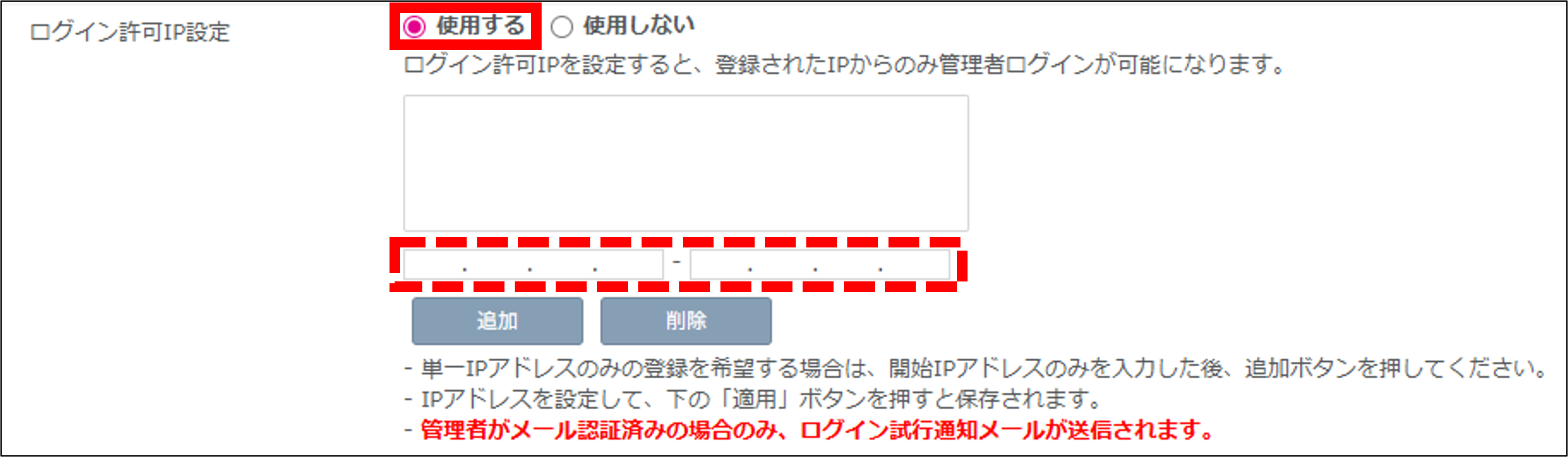 「ログイン許可IP設定」の項目で、接続を許可するグローバルIPアドレスを登録します。