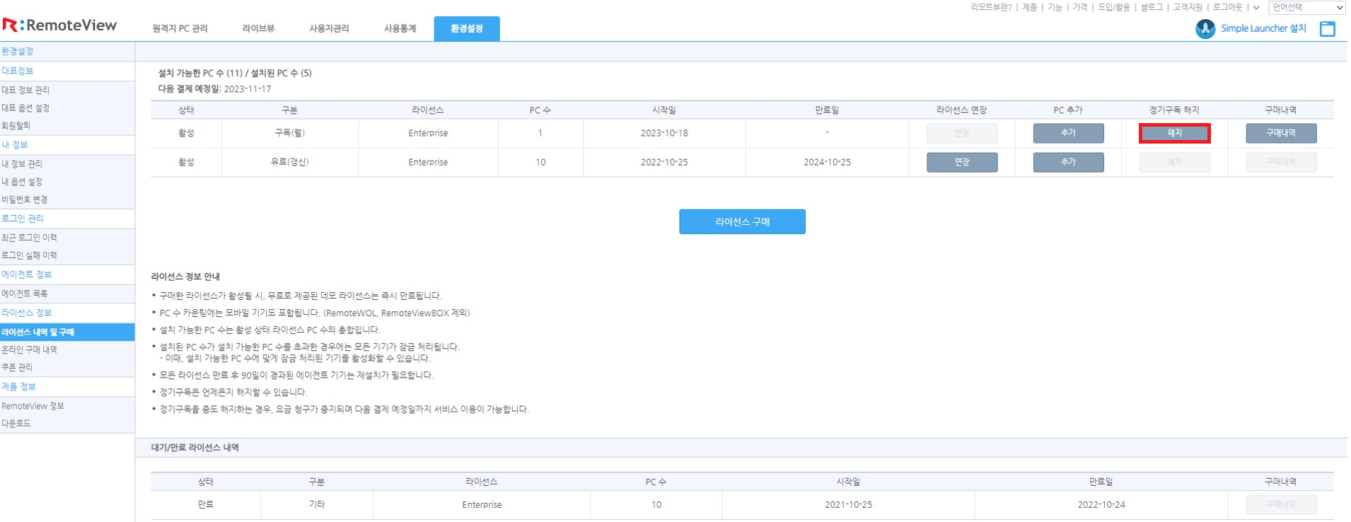 2. 상단 환경설정 > 좌측 라이선스 내역 및 구매 >해지 클릭