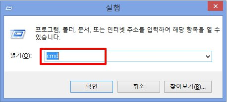 1) [Win + R] 단축키를 입력하여 실행창을 띄웁니다. 입력칸에 ‘cmd’ 기입후 Enter를 누릅니다.