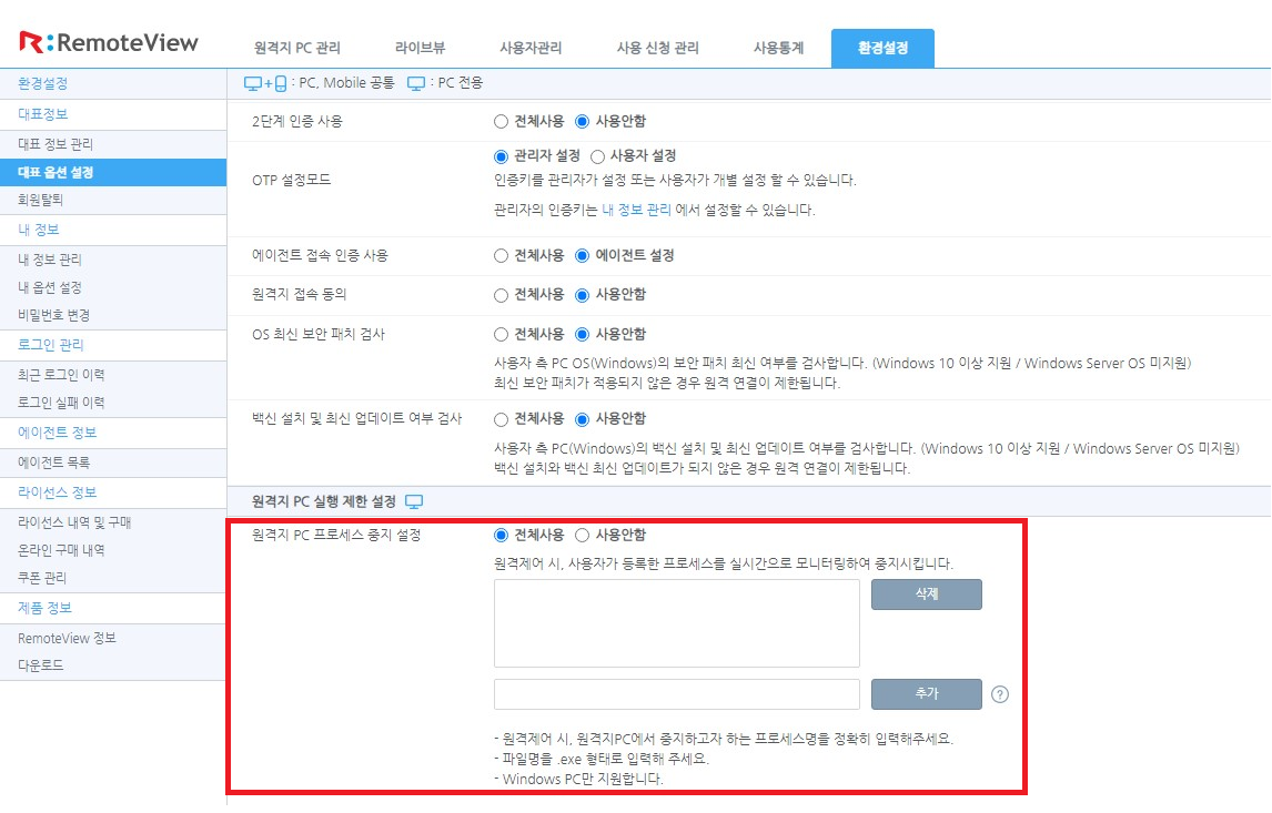 리모트뷰는 관리의 편의성을 위해 옵션에서 특정 프로그램을 차단할 수 있는 기능을 제공하고 있습니다.