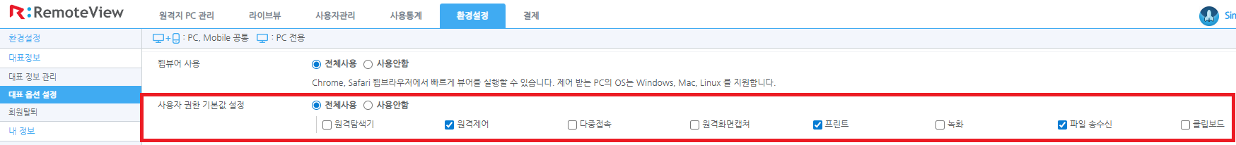 [대표 옵션 설정 - 사용자 권한 기본값 설정]
