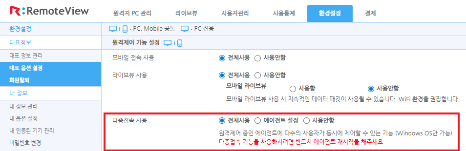 다중접속 사용 설정 옵션은 두가지를 제공합니다.