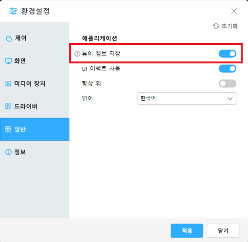 2. 환경설정 > 일반탭으로 이동 > 뷰어 정보 저장 활성화