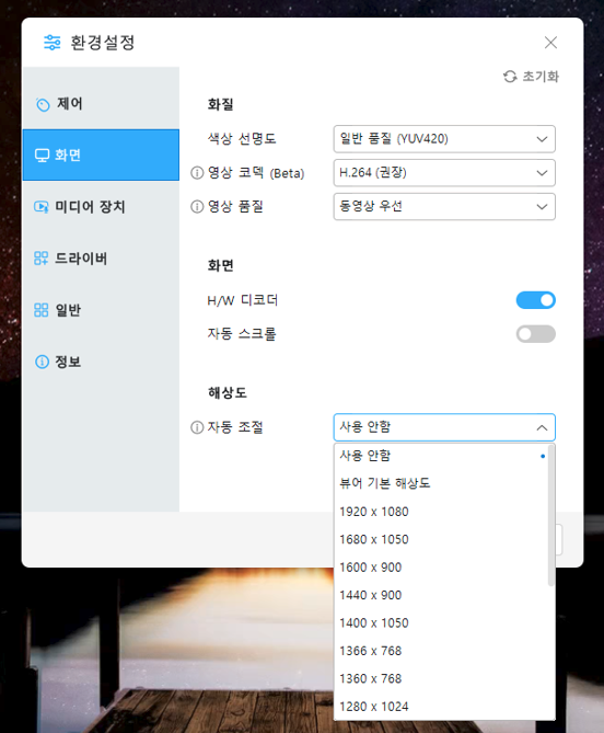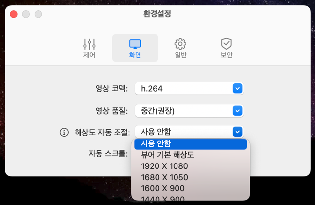 원격 이용 중 화면 해상도를 변경하고 싶으실 경우, 두가지 방법으로 해상도를 변경하실 수 있습니다. [에이전트 자체 설정하는 방법]뷰어의 디스플레이 설정에서 디스플레이 해상도 변경 [뷰어 화면에서 설정하는 방법]1. 상단 메뉴바에서 R 버튼 클릭 > 환경설정 2. 환경설정의 화면탭 > 해상도 선택Windows macOS