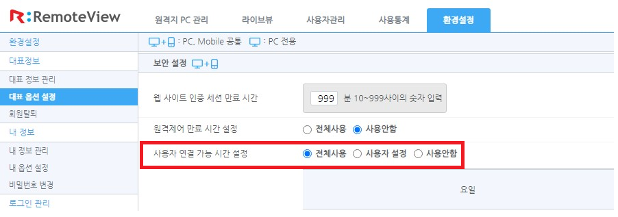 2. 아래 그림과 같이 [환경설정]->[대표옵션 설정]->[대표 옵션 설정]->[사용자 연결 가능 시간 설정]