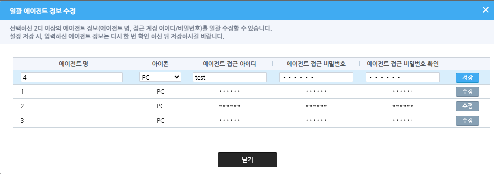여러대의 에이전트의 에이전트명, 접근계정 등을 변경하고 싶을 경우, 일괄 에이전트 정보 수정 기능을 통해 변경하실 수 있습니다. 원격지 PC관리에서 변경하고자 하는 에이전트들을 선택합니다.모바일, PC, WOL 등 기기 종류와 관계 없이 선택 및 수정이 가능합니다. 2. 일괄실행 인증창이 뜨면, 홈페이지 로그인 비밀번호를 입력합니다. 3. 일괄 에이전트 정보 수정창이 뜨면 변경하고자 하는 정보를 입력하고 저장하여 닫습니다.