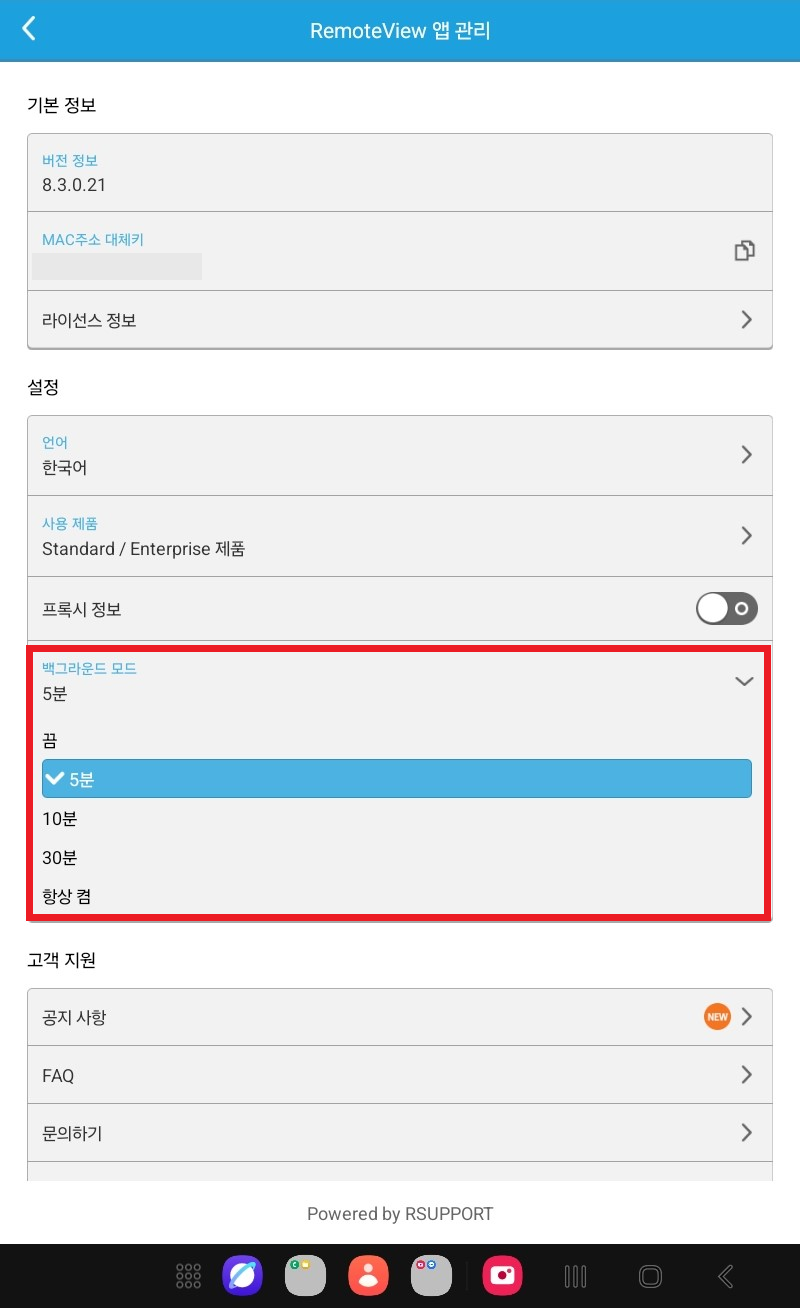 위 설정을 완료한 뒤에 원격제어 중 백그라운드로 앱 실행 시 설정한 시간동안 원격 연결이 끊어지지 않게 유지됩니다.