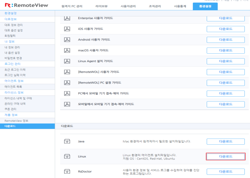 로그인 후 환경설정 > 제품정보 > 다운로드 메뉴로 이동합니다.
