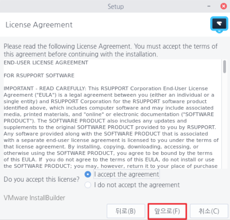 사용자 라이선스를 읽어본 후 <동의함> 을 선택하고 <앞으로> 를 선택하여 설치를 계속 진행합니다.