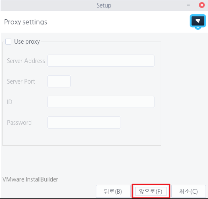 Proxy를 사용할 경우 <Use proxy> 를 체크하고 정보를 입력한 후 <앞으로> 를 선택하여 설치를 계속 진행합니다.