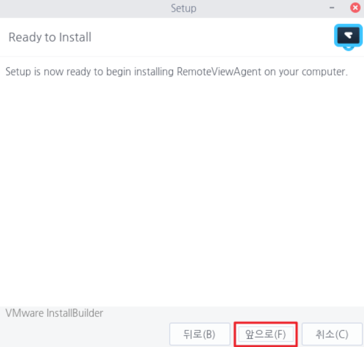 설치 준비가 완료되었음을 알리는 페이지에서 <앞으로> 를 선택하여 설치를 계속 진행합니다.