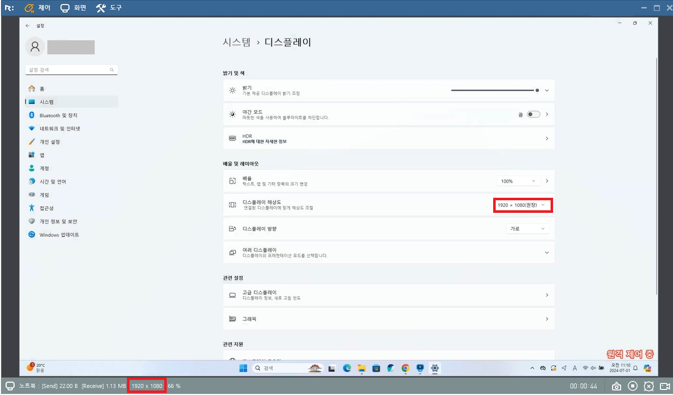 RemoteView Box를 통한 원격 접속 시 취득한 해상도와 원격지 PC의 해상도가 다른 것으로 마우스 포인터 좌표가 맞지 않는 경우가 있습니다. ◆ 원격 접속 중에 원격지 PC의 해상도를 변경한 경우 ⇒ 원격 연결을 종료한 후 재접속 바랍니다. ◆ 원격 접속 즉시 화면이 맞지 않는 경우 ⇒ 뷰어하단 (회색 부분)에 나타난 해상도에 맞춰 PC의 해상도를 변경하여 주시기 바랍니다.
